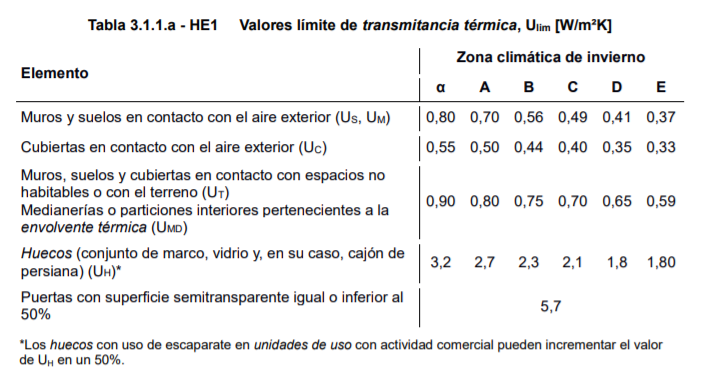 En la tabla 1 que ofrece el DB H1 del CTE vemos los valores de transmitancia térmica máximos permitidos para cada zona climática según la división de invierno.