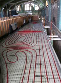 En cuanto a la climatización de los pabellones, se ha presentado el sistema de calefacción y refrescamiento por suelo radiante Rautherm S de Rehau como la mejor opción para asegurar un óptimo rendimiento del conjunto de la instalación. Este sistema se basa en la emisión o absorción de calor generado por el agua que circula por el interior de la superficie radiante. De esta manera, se consigue un óptimo ahorro energético ya que distribuye de forma homogénea y controlada el calor, asegurando una temperatura media de 23-24ºC en los pabellones.