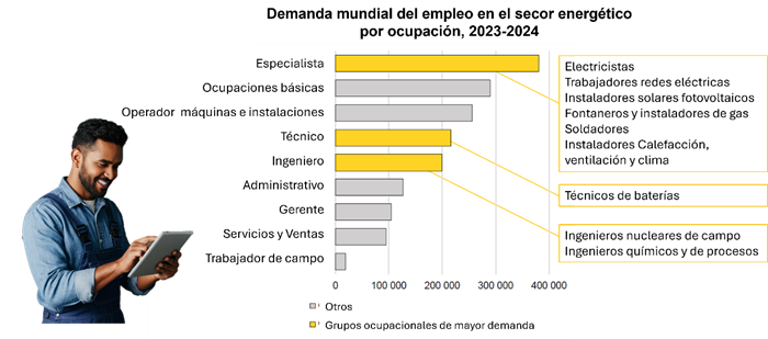 En el mismo estudio, la Agencia internacional de la Energía nos revela las 6 profesiones con mayor demanda a nivel mundial, que también lo son a nivel nacional y siempre dentro del perfil que apuntamos anteriormente de Técnico Especialista: electricistas, trabajadores en redes eléctricas, Instaladores solares fotovoltaicos, fontaneros e instaladores de gas, soldadores e Instaladores Calefacción, Ventilación y Clima (HVAC).